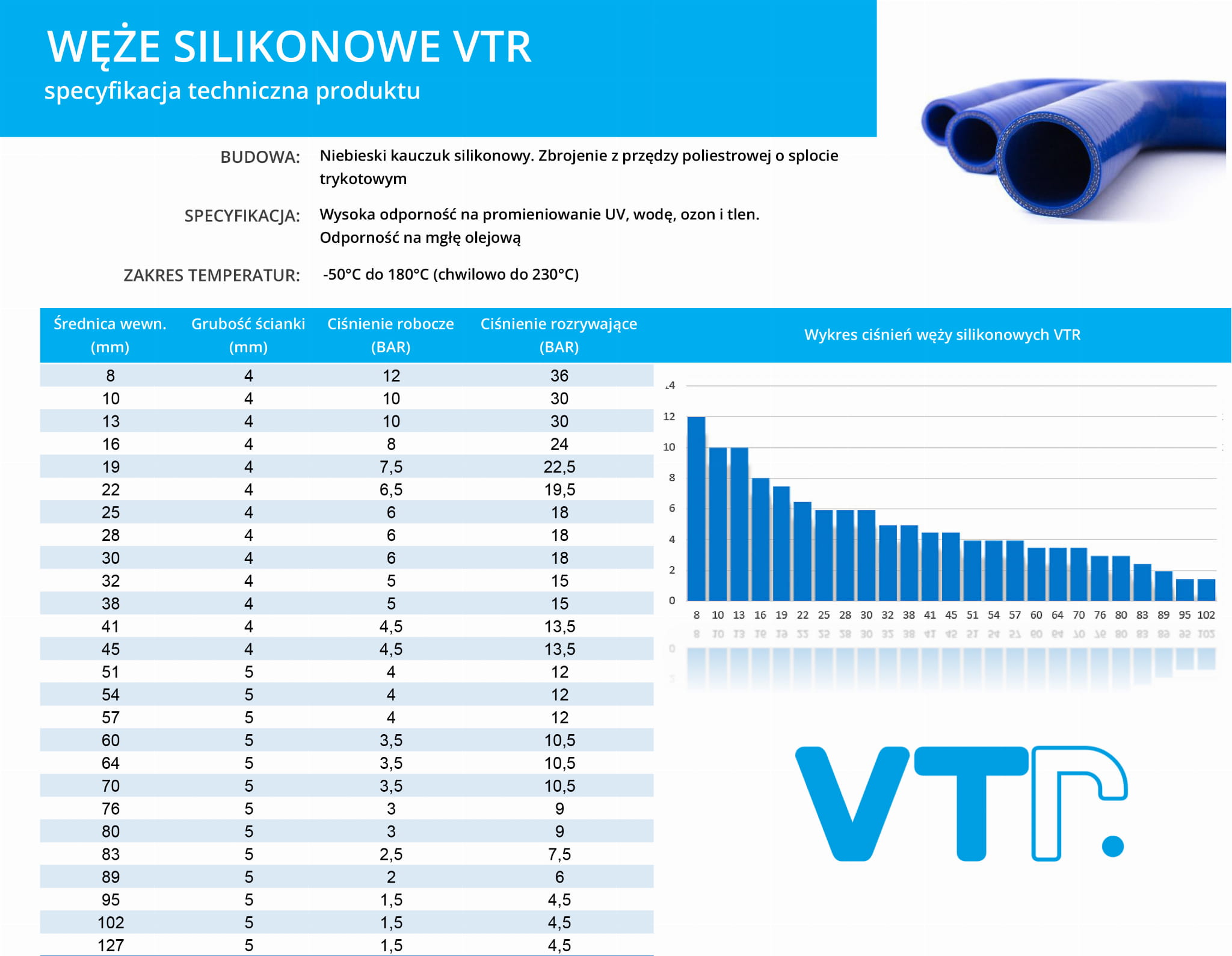 Oferowane przez nas węże silikonowe wykonane są z najwyższej jakości kauczuku silikonowego. Są bardzo odporne na wysoką temperaturę zachowując jednocześnie elastyczność w bardzo niskiej temperaturze (-50st.C ÷ +180st.C okresowo +230st.C).