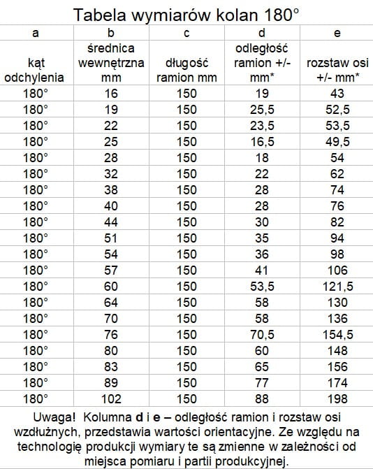 W przypadku kolan, długość ramion mierzona jest od środka łuku w połowie grubości przewodu.