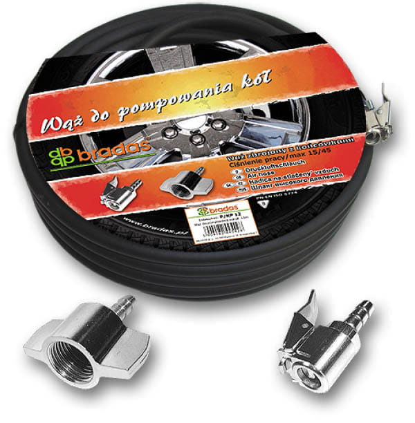 Komplet do pompowania kół. Wysposażony w wężyk, nakrętke typu "motylek" oraz końcówkę zakładaną na wentyl