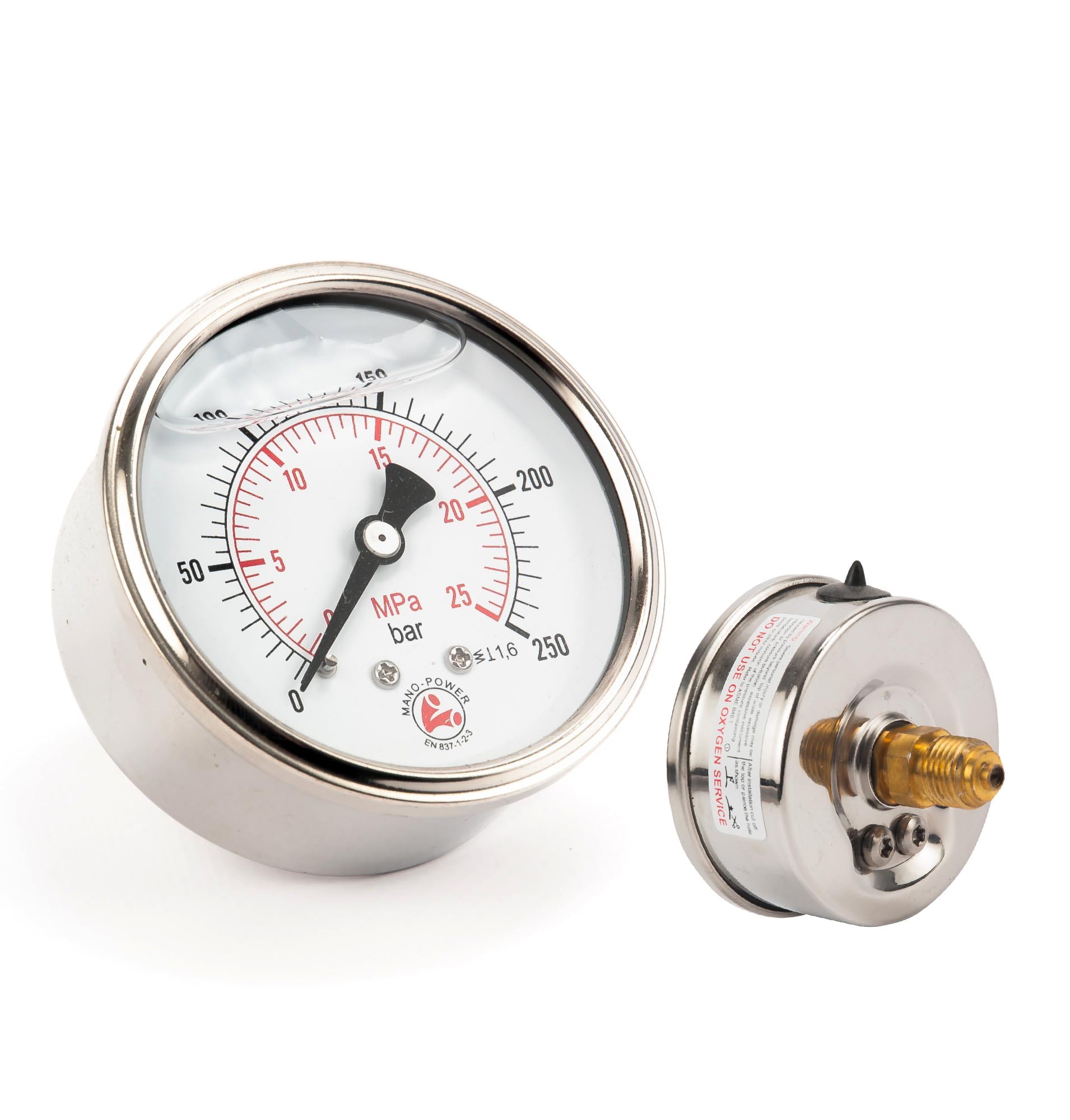 Informacje dodatkowe Wnętrze manometru zostało wypełnione gliceryną, która tłumiąc wibracje mechanizmu związane na przykład z pracą pompy, umożliwia nie zaburzony przez drgania wskazówki odczyt dokładnej wartości ciśnienia względnego.
