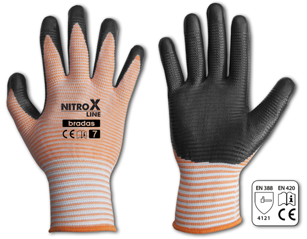Rękawice powlekane nitrylem, o prążkowanej powierzchni. Wykonane z dzianiny poliestrowej - ścieg 13 (U3). Odporne na smary, oleje, tłuszcze, węglowodory i rozpuszczalniki. Rozmiar: 10